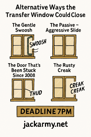 And yet, why does it always have to slam shut? Why not just close quietly, with a polite click or maybe a dignified thud? Every year, the language is the same: slammed shut, bolted down, sealed off like a bunker. You’d think the EFL were locking away state secrets, not finalising squad lists. Maybe it’s the drama we crave, the illusion of urgency. Or maybe it’s just tradition—like calling every 19-year-old winger a “wonderkid” and pretending fax machines still matter.